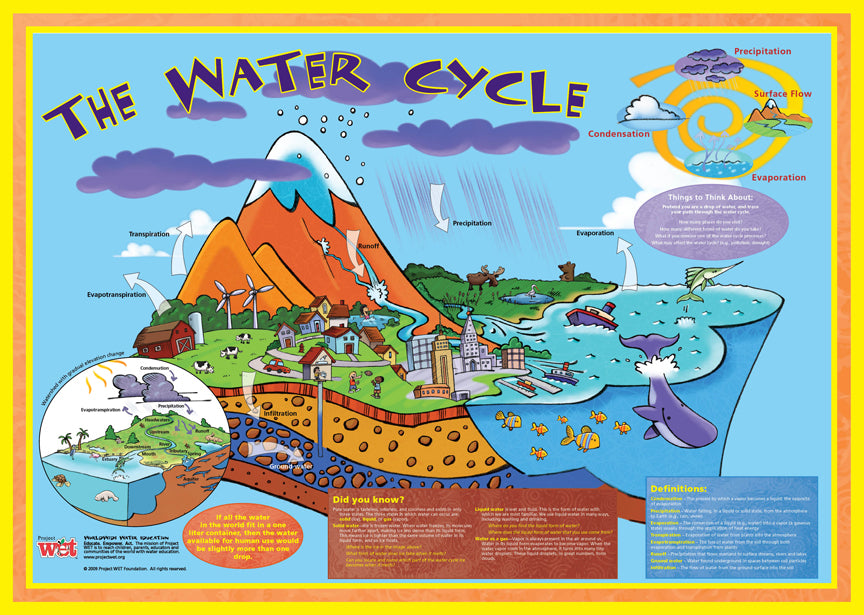 This ever-popular poster is an excellent tool for teachers to educate children about the water cycle. The quality 23.5-by-33-inch poster explores the concepts of condensation, evaporation, evapotranspiration, infiltration, ground water, precipitation, runoff, surface flow and transpiration. Includes a full-system diagram; definitions; discussion of water in the three states of matter; and student questions.