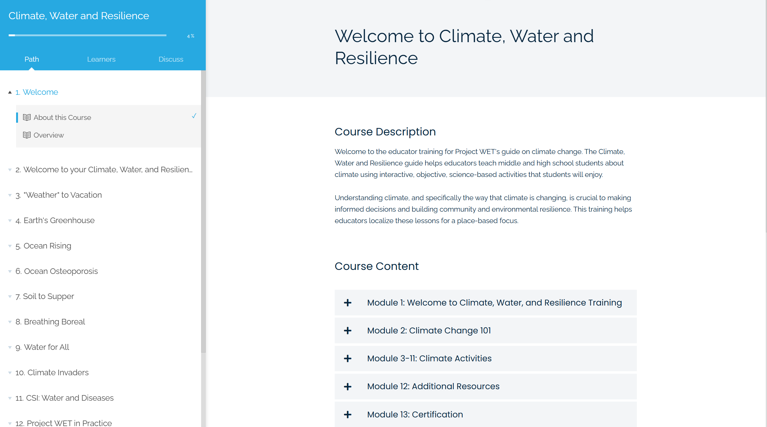 Prepare yourself to address the critical challenges of our time with our Climate, Water, and Resilience online training program. Designed for educators, environmental professionals, and anyone passionate about creating a sustainable future, this comprehensive training equips you with the knowledge and tools to understand the intricate relationship between climate change, water resources, and community resilience.