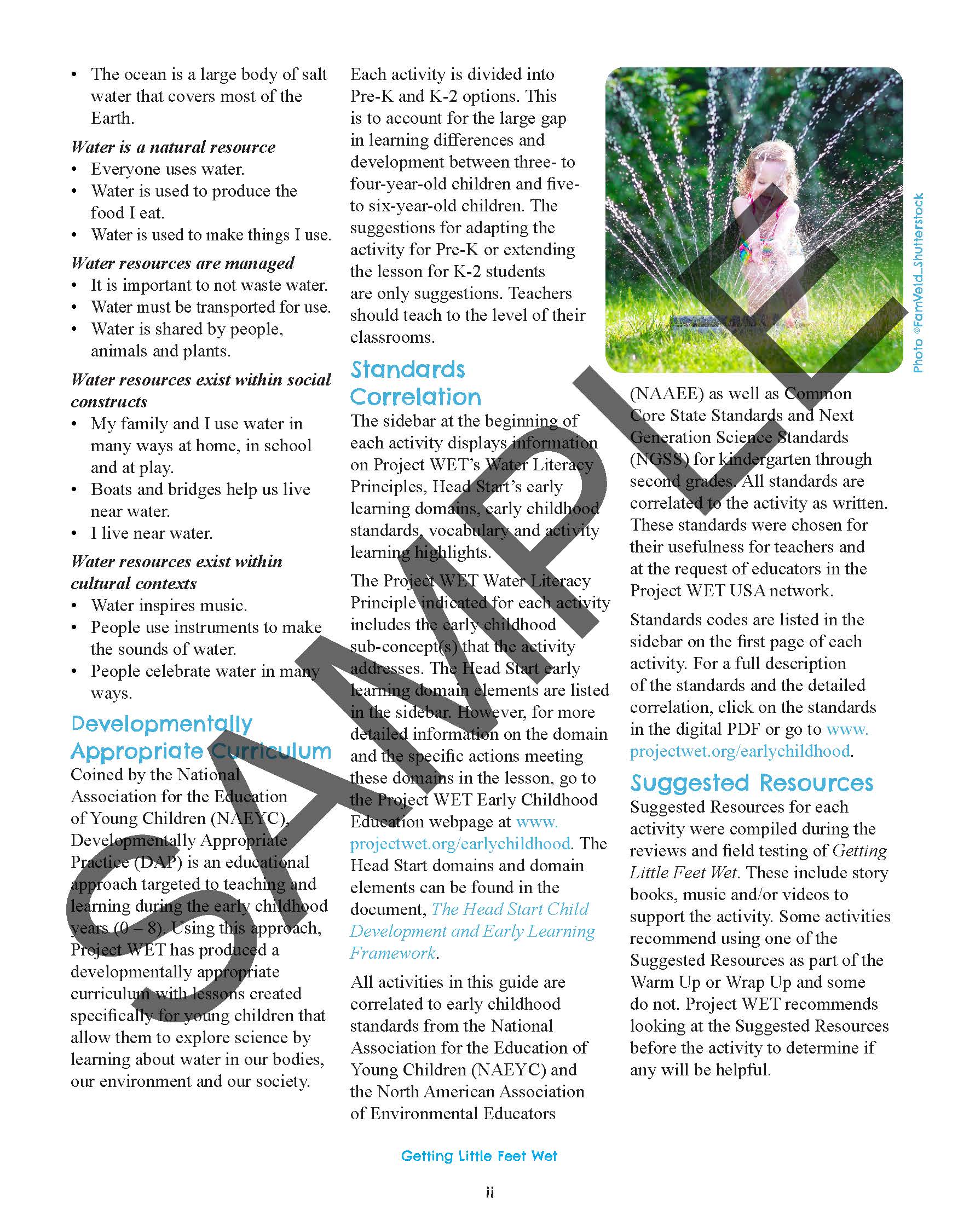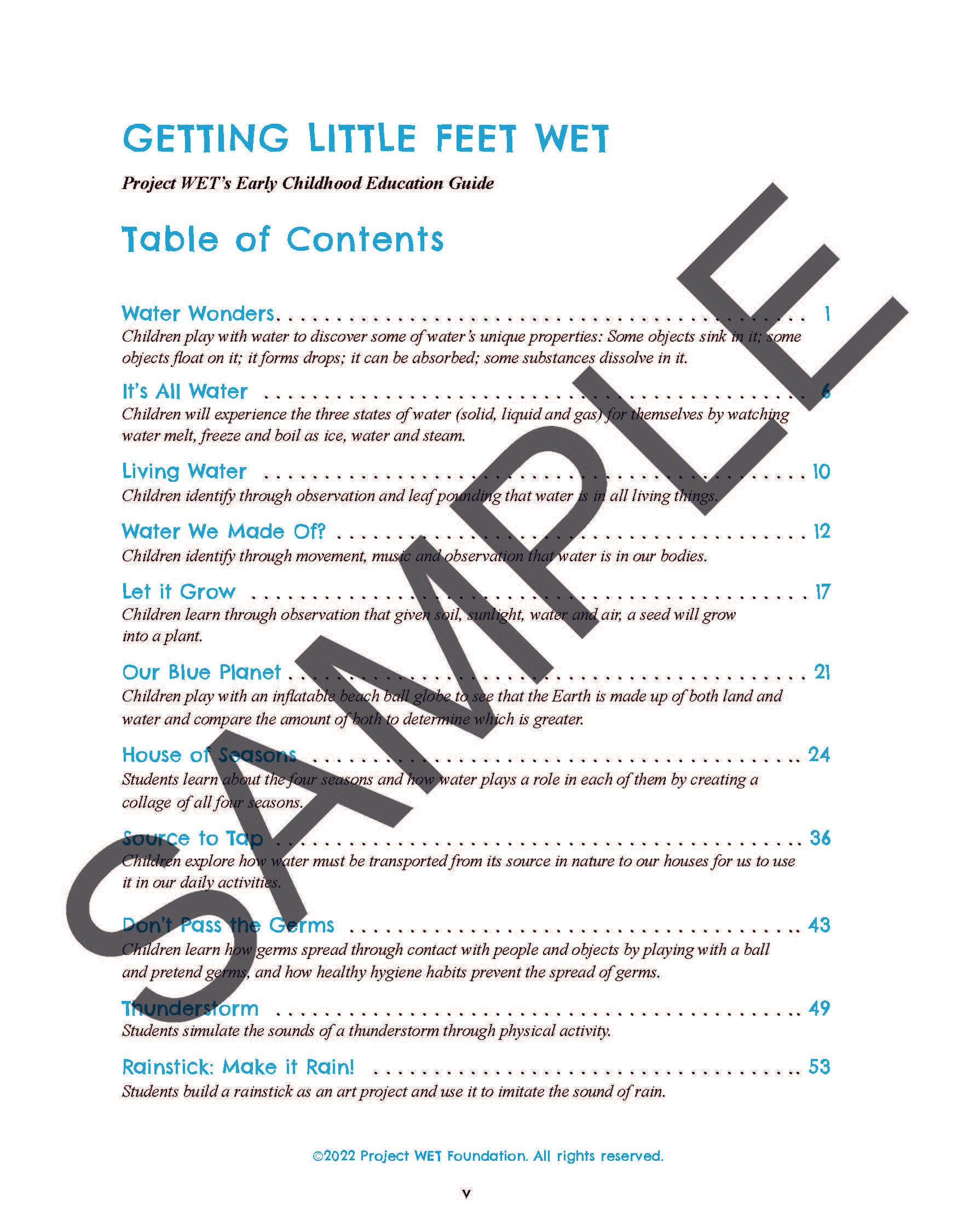 Developed in coordination with early childhood experts and educators, Getting Little Feet Wet is designed to help educators of young children teach about water in fun, age-appropriate ways. This book contains 11 interactive, hands-on activities for young learners to explore different aspects of water—from water properties to water sounds. Each activity offers both Pre-K and K-2 options and is correlated to educational standards.